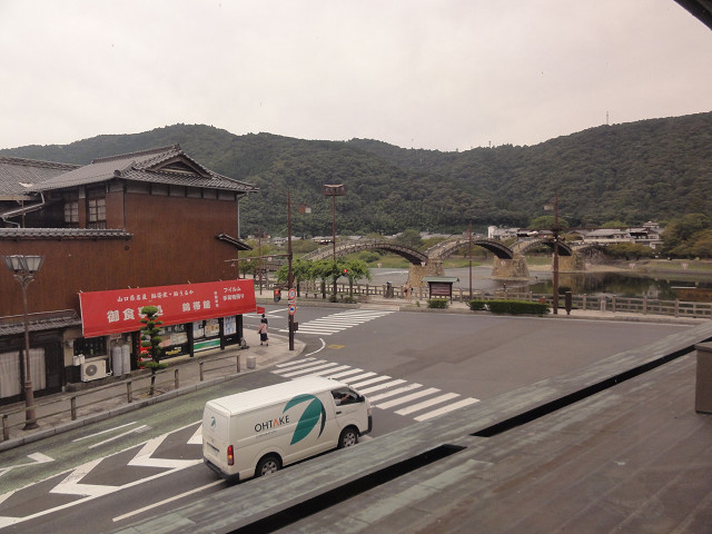 ガイドさんから「錦帯橋を色々な角度から見る事お薦めします。」の言葉を思い出して、先ずは2階へ。土産物店とお茶処がありました。確かに錦帯橋を眺めるには絶好の場所で「展望市場」とは名の通りでした。解放されてた屋上からも錦帯橋が良く見えました。