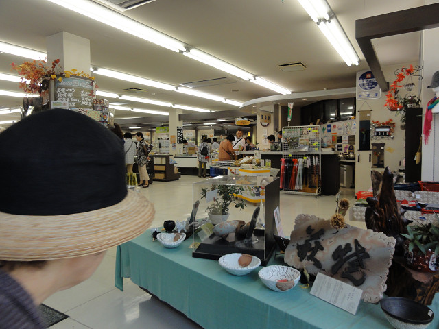 冷たいヤーコン茶を頂いて買い物タイムになりました。鍾乳洞だからか石のグッズも色々ありました。牛蒡の煎餅やうどん他お菓子から地酒、萩焼の賞をとった食器迄色々あり、目の保養になりました。