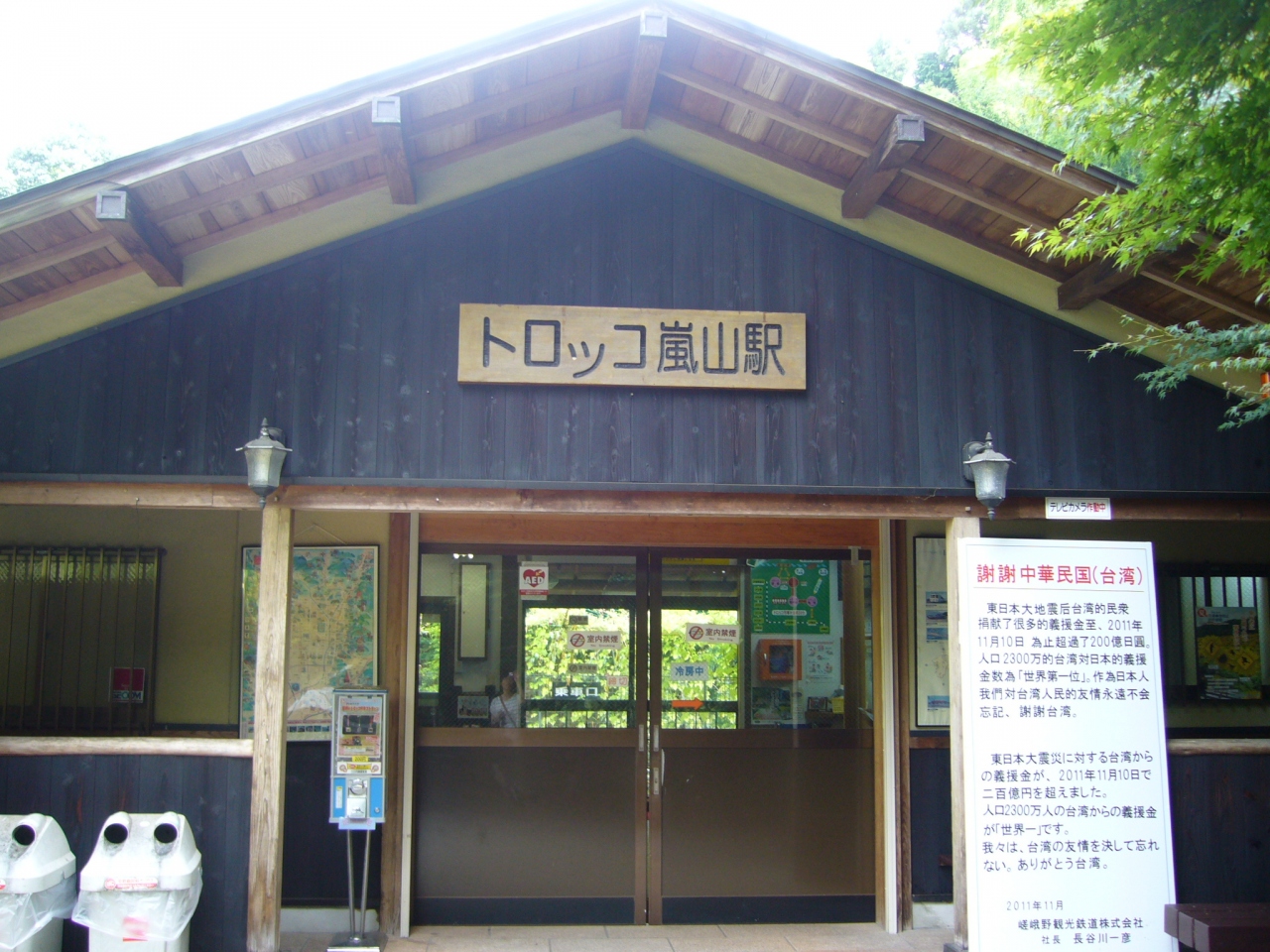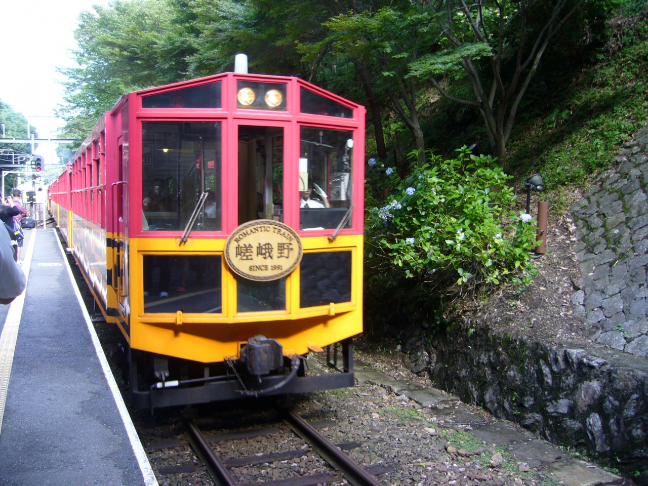 嵐山の天龍寺を出て、竹林を抜けるとトロッコの乗り場嵐山駅がある。終点の亀岡まで、7.3キロ、約25分の旅が始まる。トロッコもカラフルな電車で、オープンエアで見る景色は楽しい。雄大な渓谷美と保津川の景色が楽しめる。保津川では楽しそうに船下りを楽しんでいる姿も見かける。途中で、トロッコの中で写真を撮り、売りに来る。