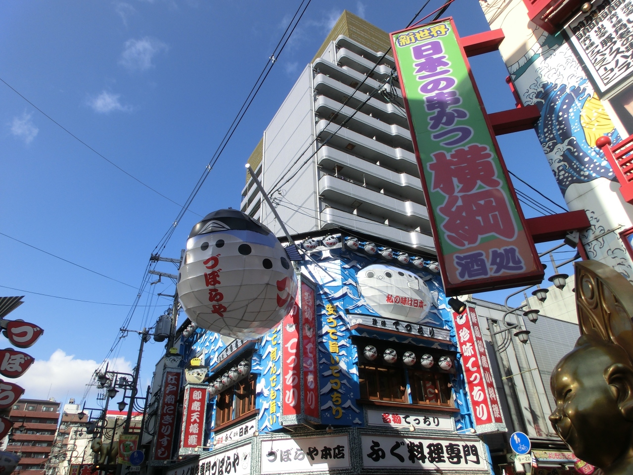 地下鉄動物園前駅を降り、アーケード街(ジャンジャン横丁)を抜けると、たこ焼きや串カツのお店がズラリ現れ、まさに大阪といった雰囲気です。
