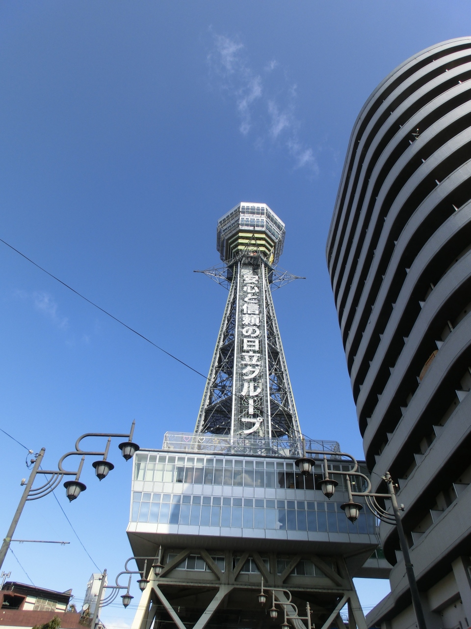 大きなふぐの飾りの「づぼらや」を右折すると、通天閣が目の前に現れます。