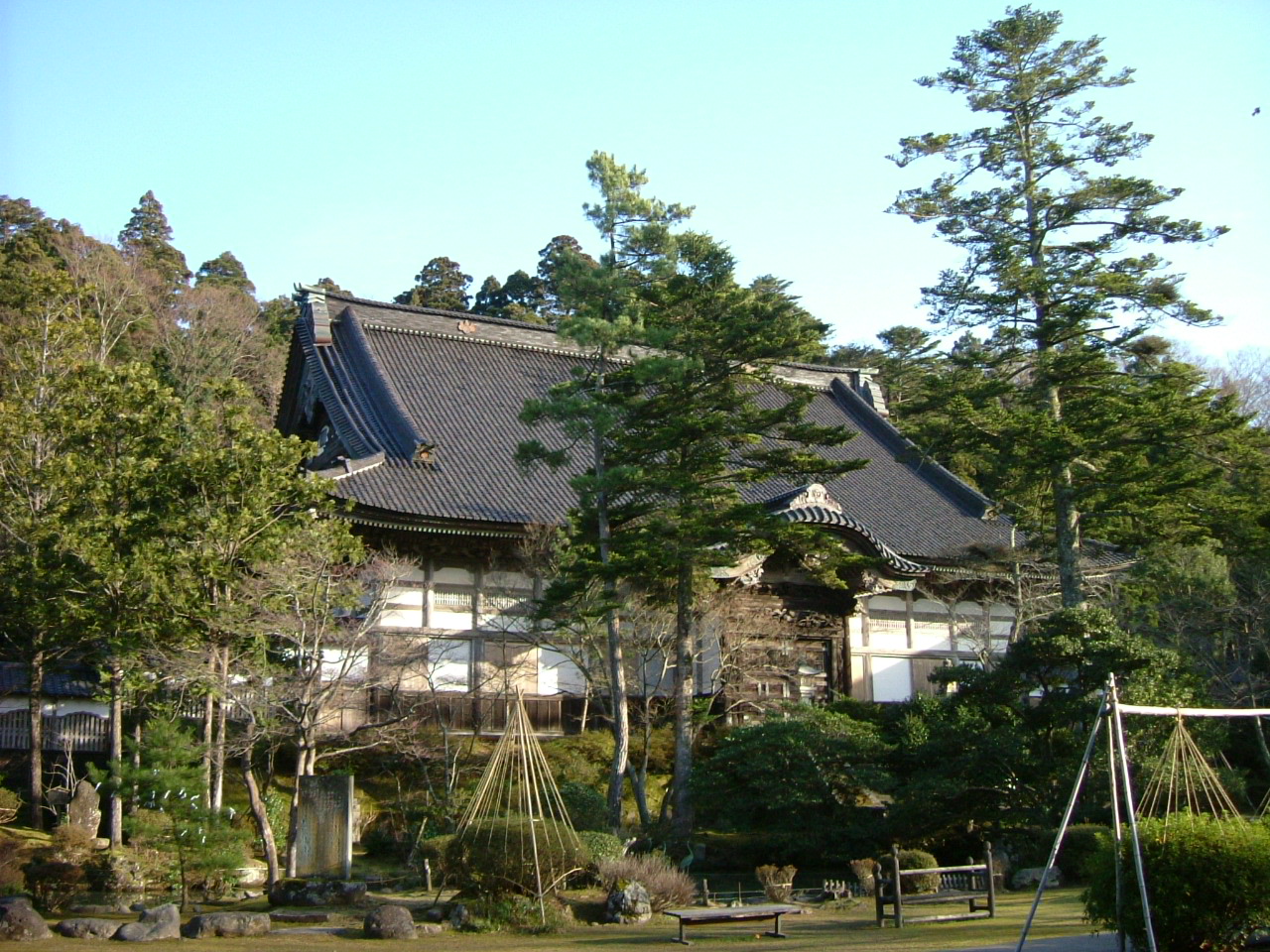 曹洞宗の大本山總持寺祖院は、7百年前の開創。江戸時代には、全国に末寺1万6千わ抱える大寺でしたが、明治の火災で七堂伽藍の大部分をを焼失。これを機に、本山は横浜の鶴見に移転、ここは祖院となりました。しかし、曹洞宗では、福井の「永平寺」を「越本山」、能登の総持寺「能本山」と言ってきた歴史の地であり、再建された現在の姿も、十分にかつての隆盛の面影が感じられます。特に、写真の法堂(大祖堂)の内部は必見。総欅造りの広い空間には、山形県の名工、高山富十が親子2代に亘って彫刻したという欄間など、ため息が出るようなすばらしさでした。