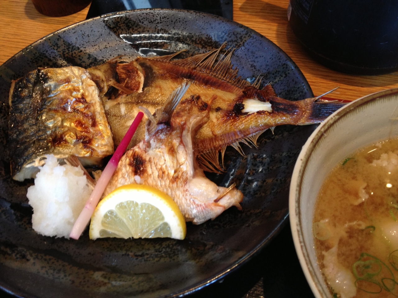 新大阪にある魚がおいしいお店。ランチに訪れ、「焼魚定食」をオーダーしました。3種類の焼魚がサーブされ、外側パリパリ内側ジューシーでおいしかったです。お味噌汁も具沢山で満足でしたが、唯一ごはんがあまりおいしくなかった点だけが残念でした。