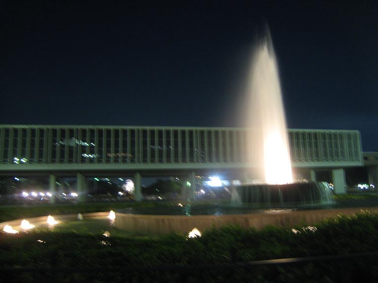 平和大通り側にある「祈りの泉」(噴水)のある場所から平和記念資料館を見ると、一階は柱だけなので平和記念公園全体が見渡せます。私たちがこの場所にいたときは暗かったのでライトアップした原爆ドーム、それに慰霊碑がよく見えました。