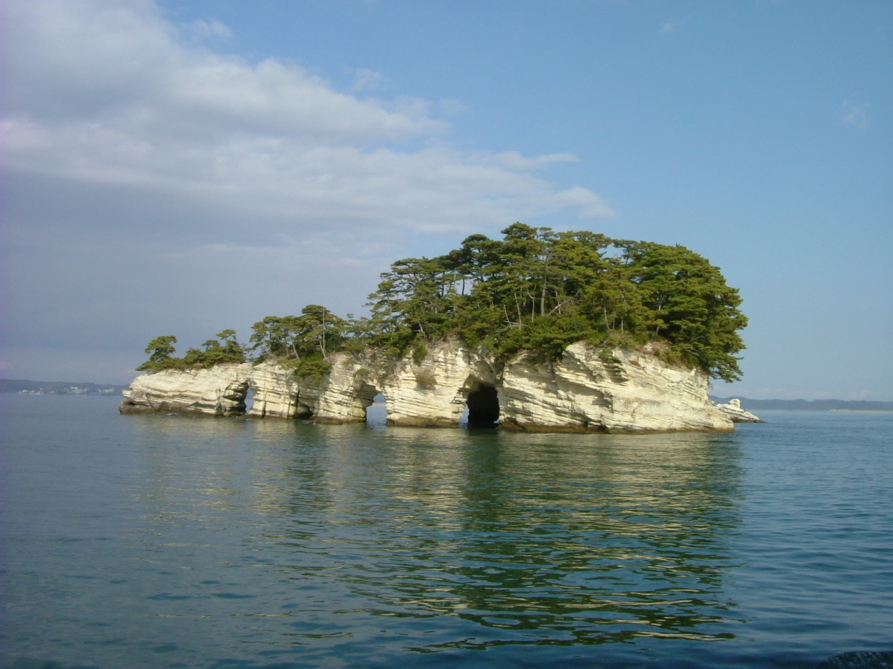 松島は、海に浮かぶ島々が美しい景色を造っていますので、松島遊覧船は、松島観光では最高の観光手段でしょう。松島海岸駅から歩いて10分ほどの桟橋から出ています。ただ、乗ってまずびっくりするのは、ウミネコ。船の後をたくさんのウミネコが付いてきます。餌付けされているんでしょうか、観光客に餌をねだっているのですが、パンとかお菓子の類を上手にキャッチします。家族連れ、子供たちには大うけでした。さて、沖に出ると、仁王島、鐘島、桂島など大小の奇岩があります。写真は、鐘島。島に空いた4つの穴。これに打ち寄せる波の音が鐘を打つ様に聞こえるのだそうです。