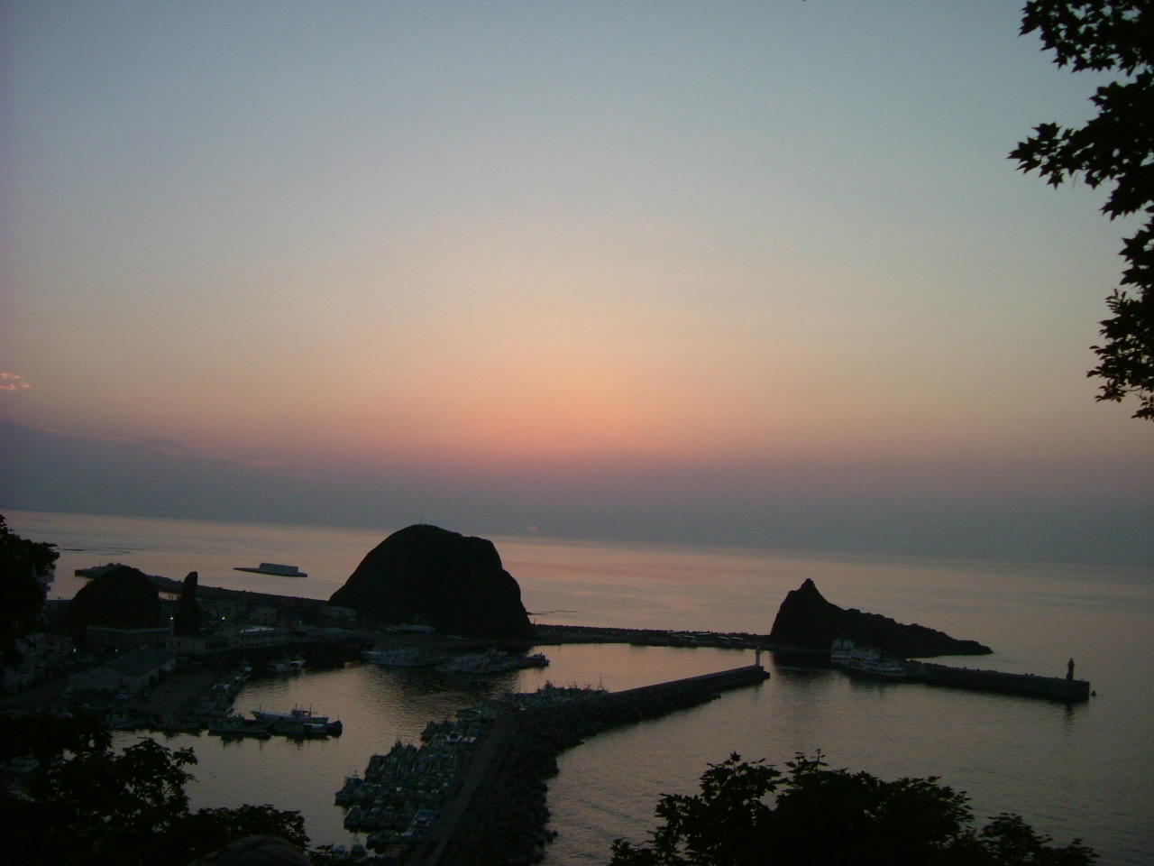 夕陽台からオロンコ岩沖合いを眺めた景色。ウトロ港の近くにあって、知床八景の一つ。オロンコ岩とウトロの町並みや港、オホーツクの海が一望できて、素晴らしいです。太陽が沈むに連れて色彩が変化し、刻々と表情を変える自然の姿に感動しました。