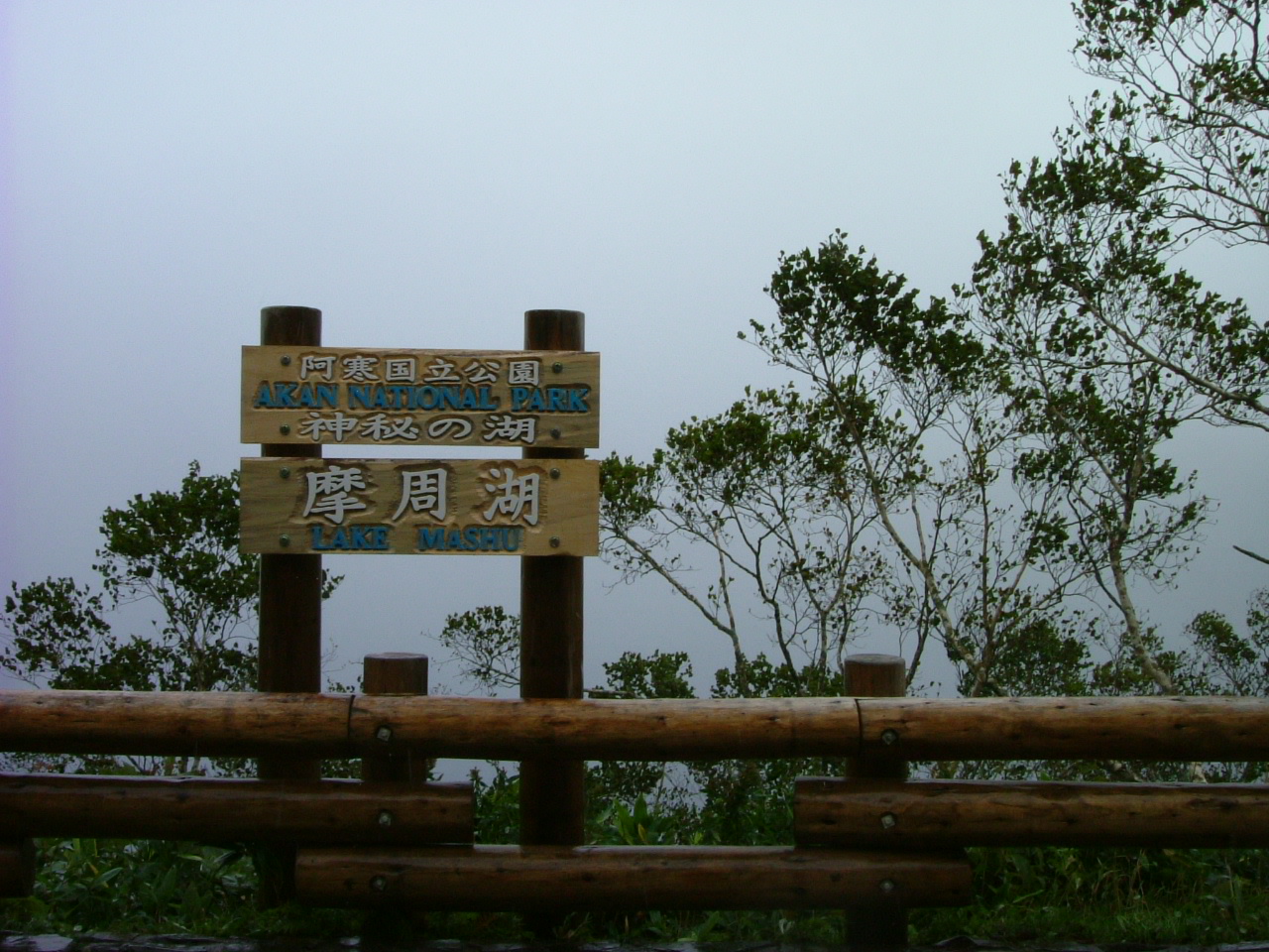 摩周湖は、阿寒国立公園の一部。霧の摩周湖として有名ですが、この日も深い霧。なんと台風も近づいていて、すごい風でした。写真は、レストハウスを出てすぐの場所。本来は、ここから美しい湖面が見えるのでしょうが、おぼろげにしか見えませんでした。レストハウスの中には、摩周湖の四季を映したビデオ放映があって、こちらで何とか気分を盛り上げました。世界でもバイカル湖についで2番目に透明度の高い湖。約7000年前の巨大噴火によって生成されたカルデラ湖です。アイヌ語では、山の神の湖。湖の中央に、小さなカムイシュ島があって、これがアクセントになっていますね。流入や流出する河川がない閉鎖湖というのも、珍しいと思います。