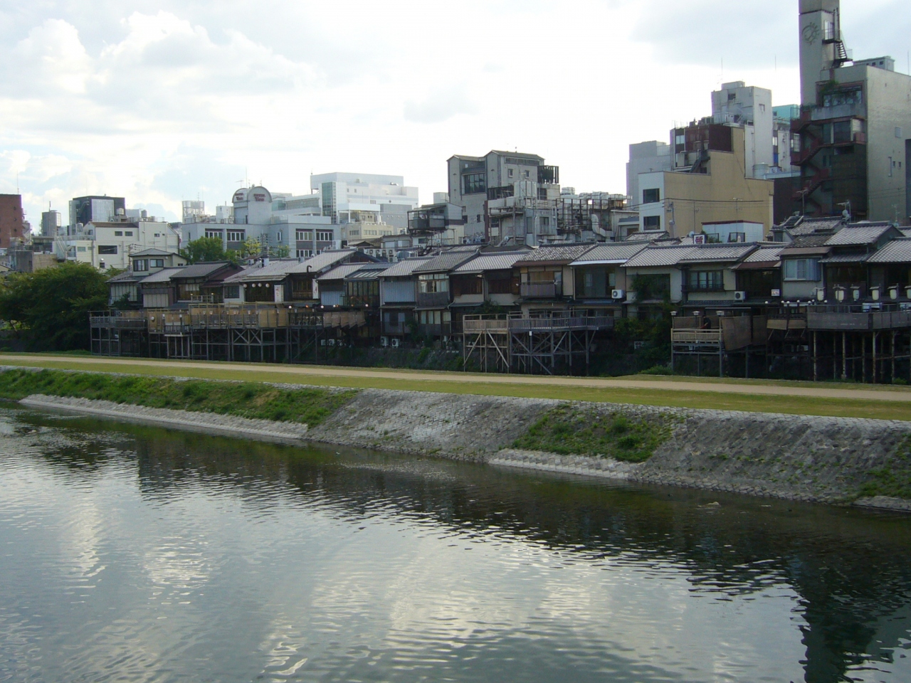 京都の代表的な川、鴨川は四条通に架かる四条大橋から眺めると、夏の風物詩でもある川床が並んでいる風景が見られる。ここから眺めると京都に来たんだなと実感する。昼はのんびり寝そべっている人がいたり、川を眺めている人がいたり、夜になると恋人たちが語り合ったりしてそれぞれ楽しんでいる。また夜はライトアップがきれいだ。