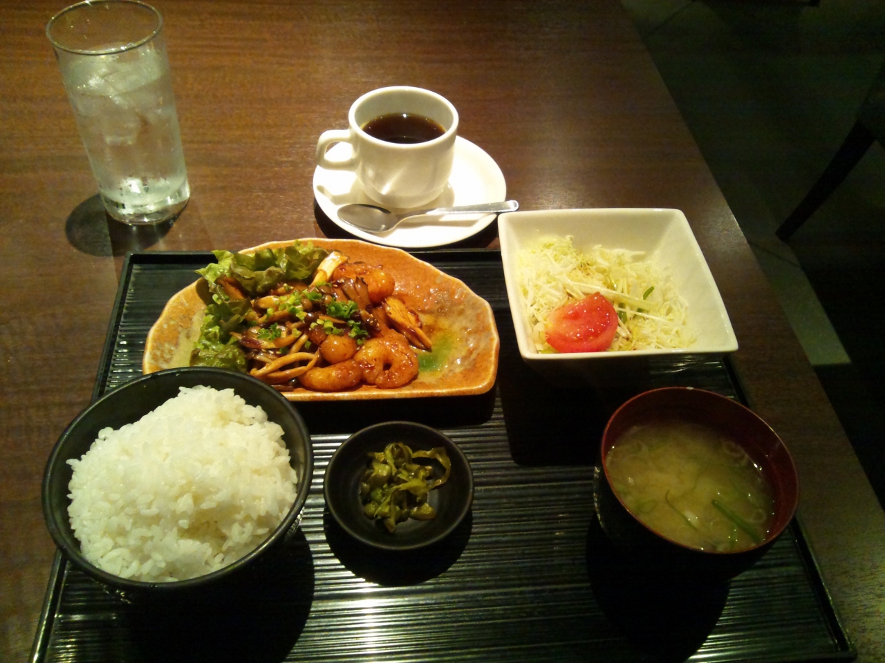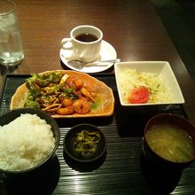 週替わり定食「エビときのこのネギラー油炒」750円、コーヒー付きを注文しました。