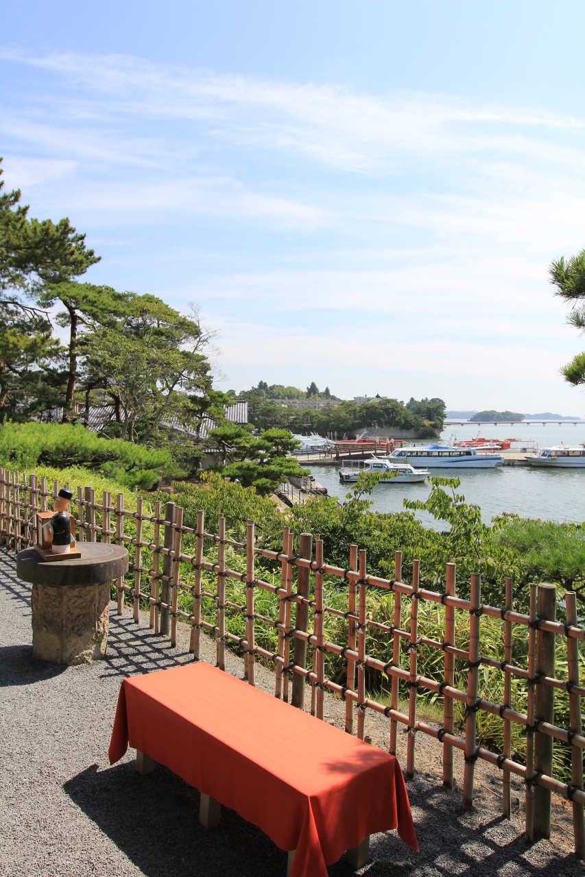建築当初は豊臣秀吉が普請した伏見桃山城にあった茶室であったと言われ、その後、伊達政宗が譲り受け江戸藩邸と移築したとされる観蘭亭。建物は木造平屋建て、寄棟こけら葺きで、海に面して三方向に縁側を廻し内部は18畳の部屋が2室あり床の間や襖、障子には金箔や極彩色豊かな絵が描かれ障壁画は国重要文化財、鳳凰図は宮城県指定重要文化財に指定されています。藩主の納涼、観月の亭として「月見御殿」とも呼ばれ、観蘭亭から眺める日本三景 松島は絶景で抹茶を食しながら景観を楽しむことができます。併設されている松島博物館には江戸文化に伊達姿を重ねた異色の大名道具、正確な5千分の1の空から見た松島の立体模型、武具、装身具、化粧道具から中世武士の生活用品等が展示されています。松島湾遊覧船乗り場付近にあるため遊覧船の時間までゆっくり景観を楽しみながら待つには最適です。