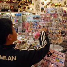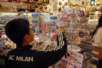 子供達が足を止めた御土産物屋さんには、アニメキャラクターの根付けをはじめ色々な種類のお土産ものが並んでいました。