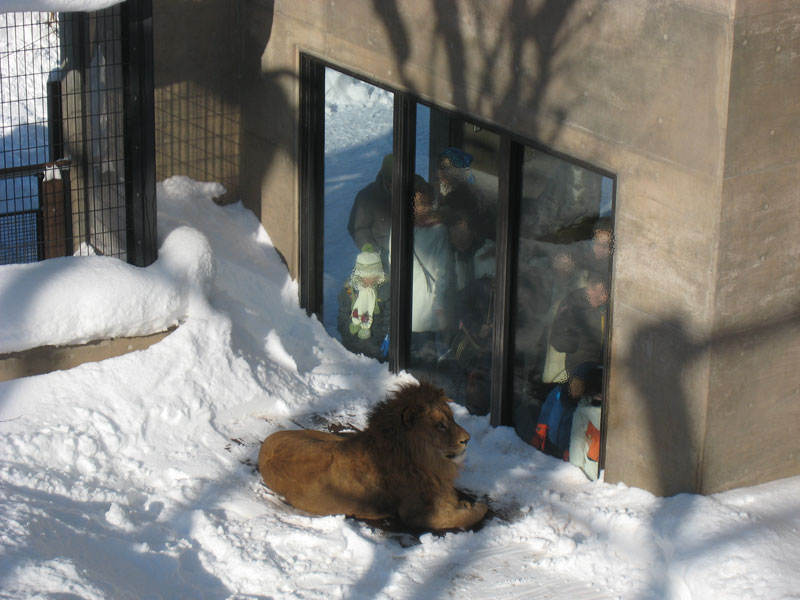 到着するなり、人・人・人!!観光客がとっても多いです。雪が積もる冬の日でもみなさんウキウキしている様子で元気いっぱいです。私が特に感動したのがライオンです。ガラス越しとはいえ、とにかく近い!!寒いからかジーっとしているので、写真もとり放題です。もちろん、他の観光客の方との譲り合いですよ。(^^)