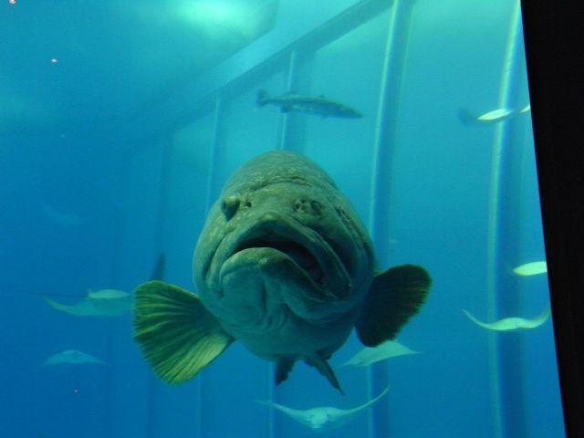 大水槽では巨大なハタ系のおさかな、タマカイがお気に入りです。ゆったーりした泳ぎで、私たちは「おじいちゃん魚(うお)」と呼んでます。