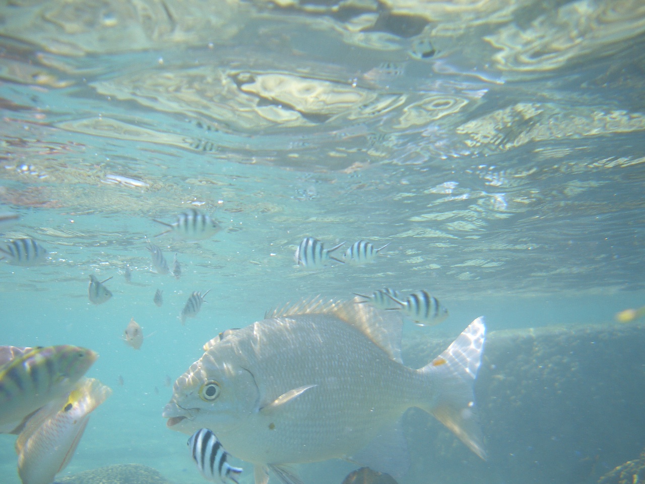魚肉ソーセージを持っていって、海中で細かくすりつぶすように撒くと大小様々の魚がたくさん寄ってきて、いい写真が撮れました。