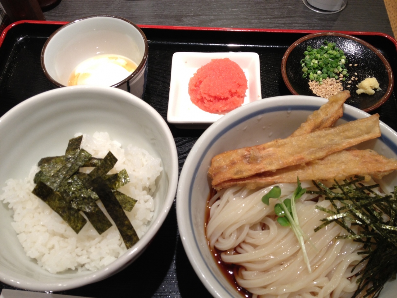 いつも「めん街道」には行くのですが、なんとなく福岡=ラーメンという固定観念があり、今までスルーしていたお店「能古うどん」に入ってみました!ごぼう天ぶっかけとめんたい卵ごはんのセットをオーダー。能古うどんは初めてでしたが、「稲庭うどん」にちょっと似た感じの細麺で、つるつるぴかぴか。ノド越しが最高に美味しい麺でした!