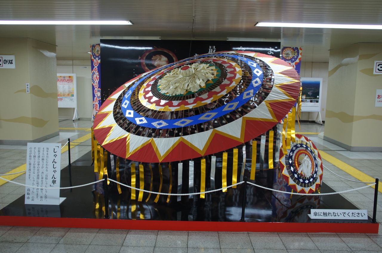 これは駅の構内に展示された「しゃんしゃん傘」。鳥取の夏のお祭り、「鳥取しゃんしゃん傘踊り」で使われたものです。しゃんしゃん傘踊りは、雨乞いを起因とした「因幡の傘踊」が元になっているようですが、名前は、鳥取の市街地の温泉で「湯がしゃんしゃん沸く」と「鈴の音がしゃんしゃん鳴る」という意味。4000人の踊り手で、熱く盛り上がるようです。