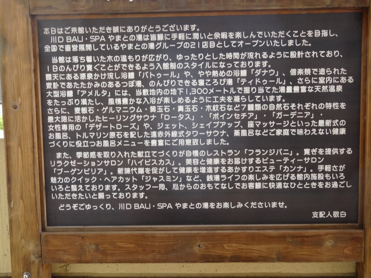 やまとと言うチェーン店展開している日帰り温泉ですが、ここだけはバリスパと言う名前の通り、他のお店とは違った雰囲気を作り出しています。駅からは遠いので車で来る事が基本ですが、露天風呂もなかなかの雰囲気です。レストランもあり駐車場も無料時間が長いので川口周辺には同様な施設がありますが、ここはお勧めです。