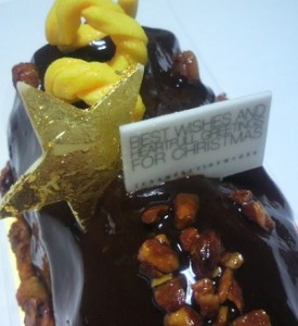 ブッシュドノエルですが、オレンジピールがたくさん入っていてダークチョコでコーティングしてある大人の味のケーキでした。