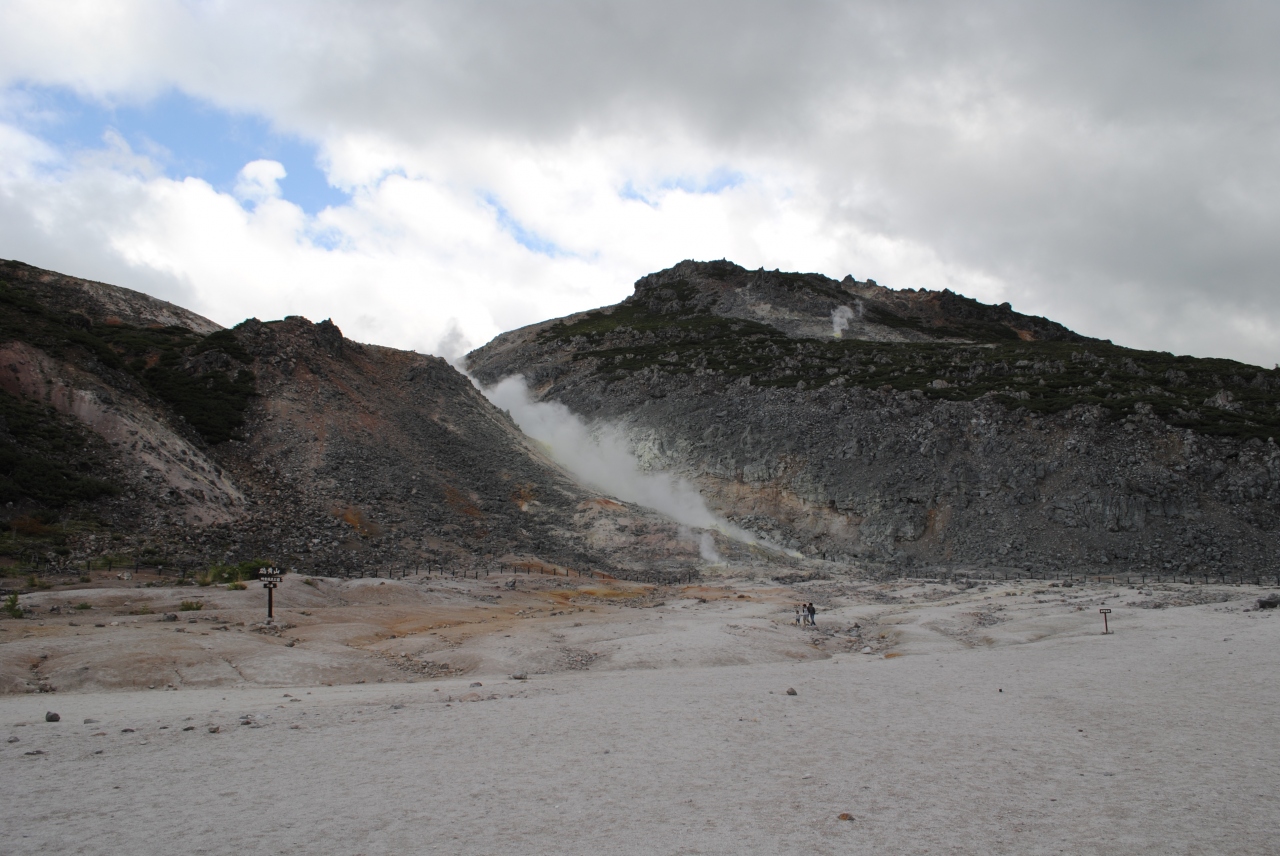 広い駐車場に車を停めると、本当に目の前に煙が上がったぼこぼこした硫黄山を見ることができます。