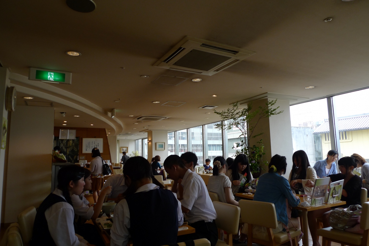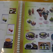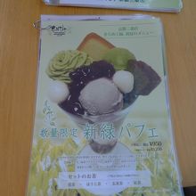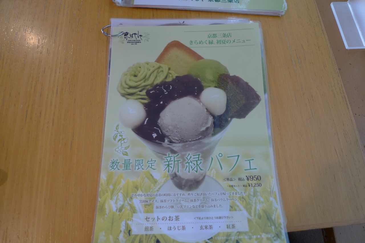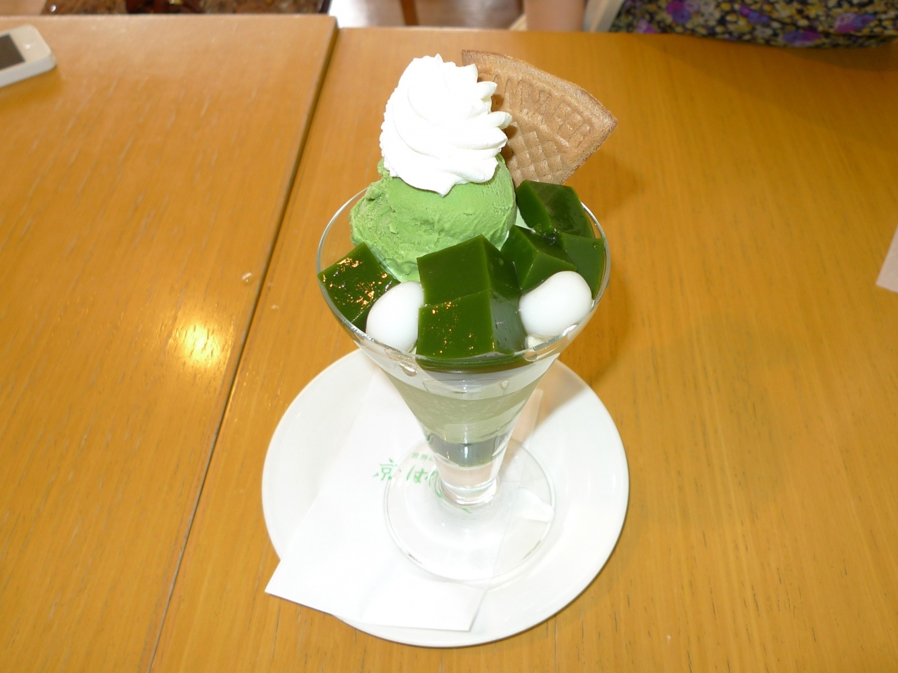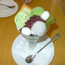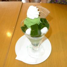 Rは季節限定の新緑パフェ、小豆が上品な甘さで美味しい。