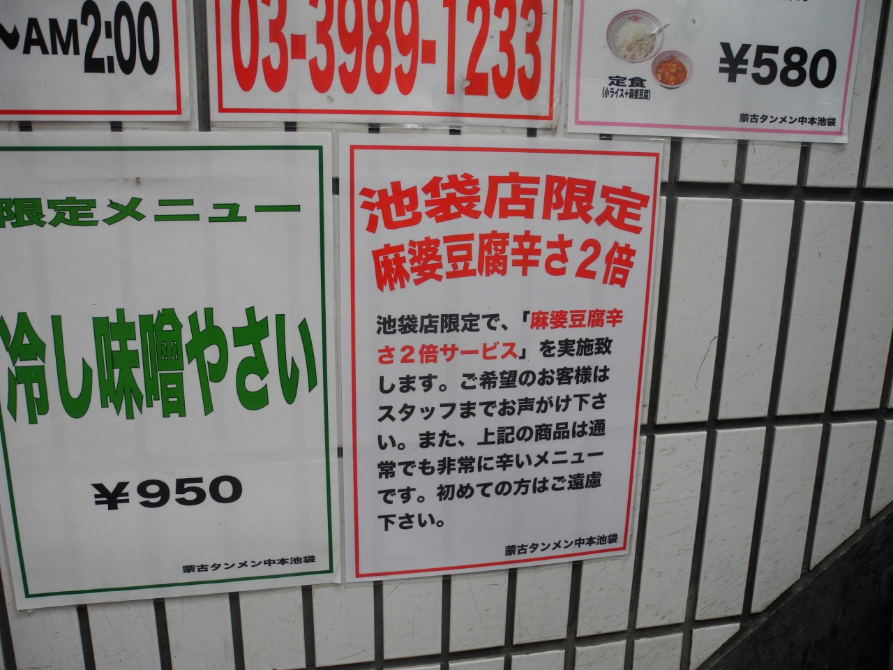 蒙古タンメンの池袋店では、池袋店限定のサービスとして、麻婆豆腐の辛さを2倍にするサービスを行っています。ただし、とても辛いメニューとなっているようで、気を付けて食べた方が良いと思います。初めての人は、まずは、普通に。だけど。挑戦してみてください