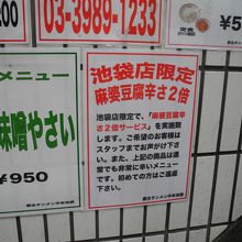 池袋店限定のサービスとして、麻婆豆腐の辛さを2倍にするサービスを行っています。