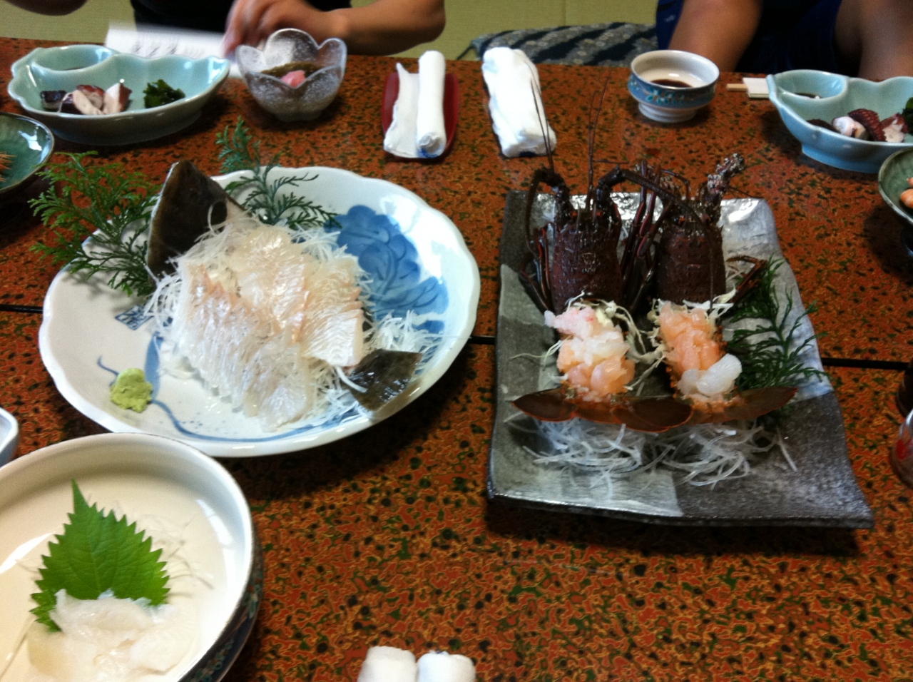 1日目は宿近くの海水浴場で小さな網を持って磯遊びをし、夕方からは民宿で竿を借りて釣り、夜は”魚&たこの手掴み大会”に参加しました。