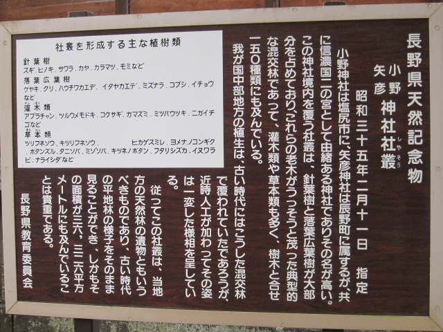 この小野の地は建御名方命が留まった地で、崇神天皇の時代に建御名方命の分霊を勧請したことが小野神社の元になった事です。坂上田村麻呂や木曽義仲が戦勝祈願の為、参拝に訪れており、また武田勝頼が鐘楼を寄進と歴代の勇将にちなんだ神社のようです。