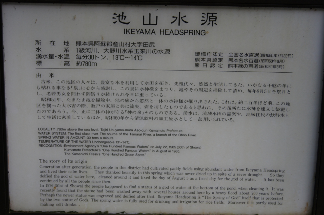 水をペットボトルなどに持って帰るのは有料のところがありますが、ここはタダです。私は12リットルのタンクを2つ持って行きました。汲むところは車が横付けできますから楽です。水はとにかくきれいで、おいしいです。この水でお茶を飲んでますが、カルキの匂いがしない水は本当においしいですね。やまなみハイウェイからちょっと中に入りますが、行くだけの価値はあります。是非、タンクを持って行きましょう。