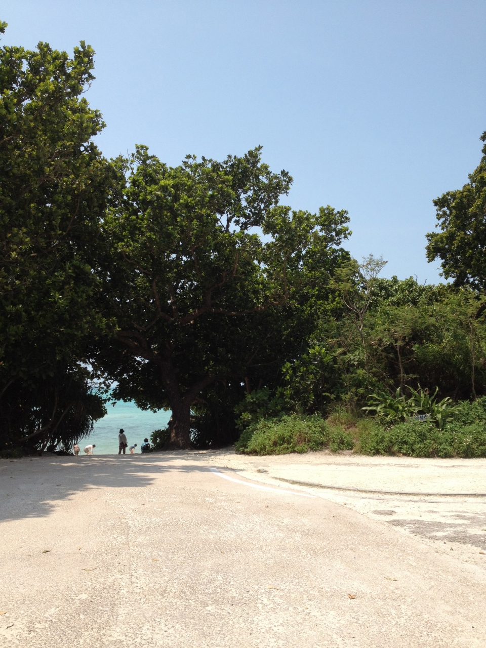 自転車置き場から見た、木のトンネル越しの浜の景色が大好きです。岩まじりで泳ぐよりも星砂を探す浜でした。本当に小さくみつけにくいので、黒い紙とピンセットが欲しかったです。入り口では星砂はどんなものか拡大鏡で展示していました。
