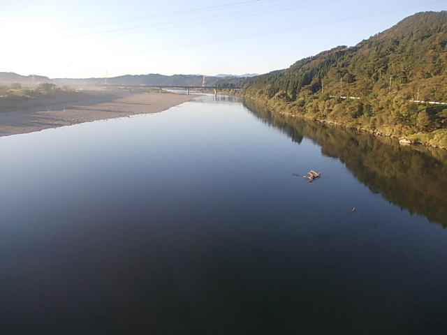 この駅付近で一番お勧めなのが、駅傍で渡る米代川の景観です。この辺りまで来ると、奥羽本線もかなり内陸を走るようになり、河口の景観ほどは広々とはしていませんが、程々の川幅を維持しつつ、滔々と流れる米代川の風景は、とても気品のある雰囲気で、好天に恵まれたので、青空とのコントラストも最高でした。