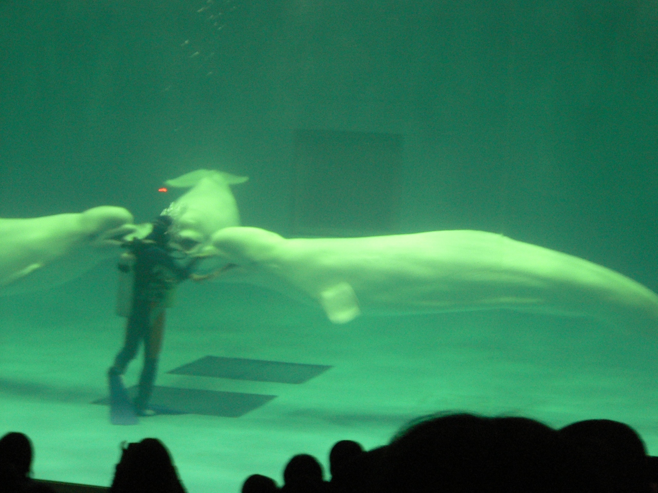 名物のシロイルカには、たくさんの見物客がいて、後ろのほうから見ることになりました。思っているよりもだいぶ大きくて、びっくりしました。