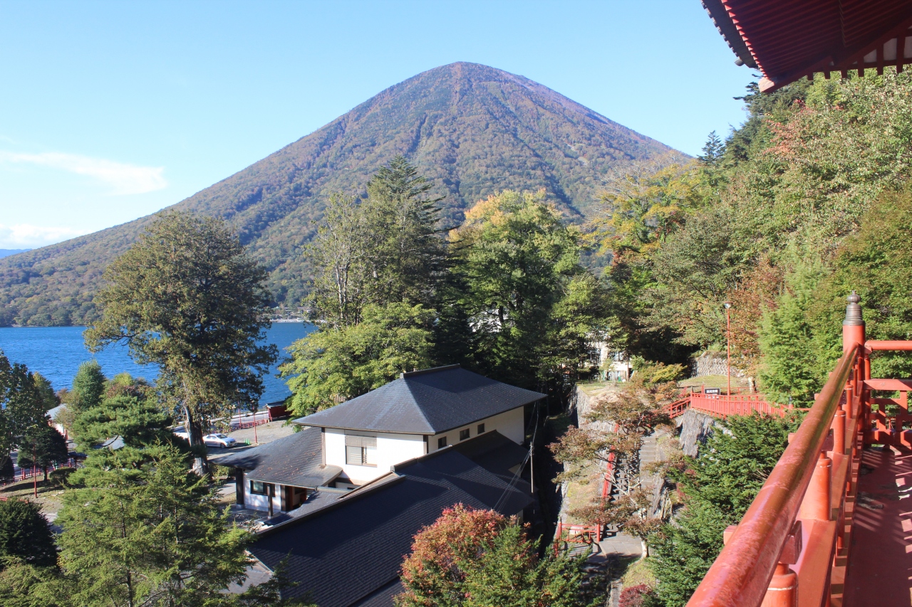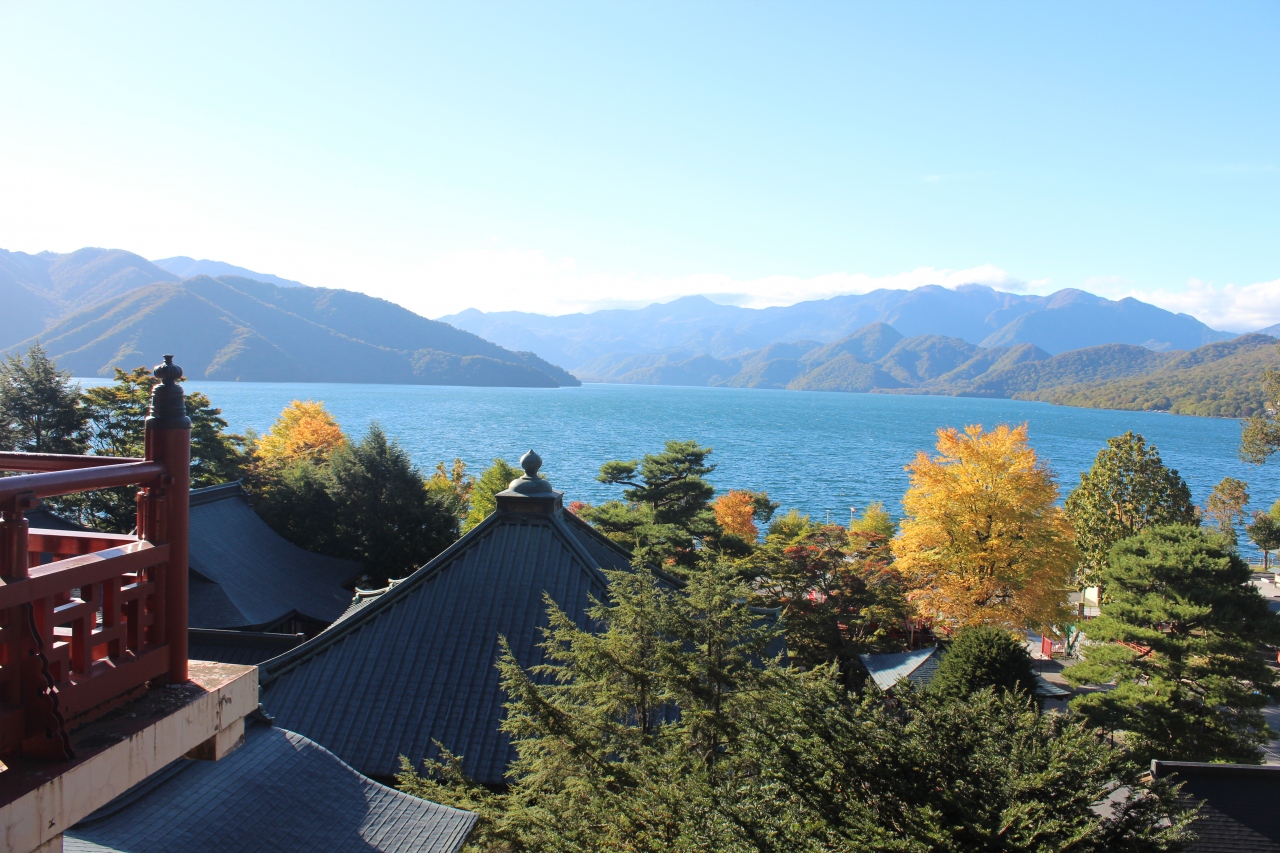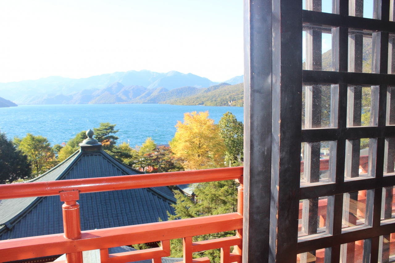 寺の最上階からの景色は みごとです。中禅寺湖が一望できます。