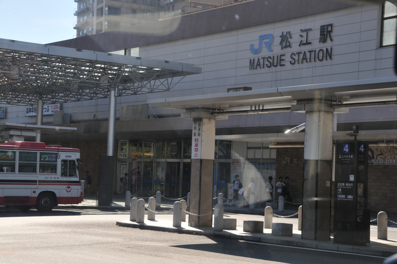 島根県の中心地、松江に位置する主要駅です。駅の北口を出て左に進むと立派なバスターミナルがあります。一畑電鉄の松江しんじ温泉駅は松江駅からかなり離れており、バスターミナルからバスで15~20分ほどかかります。