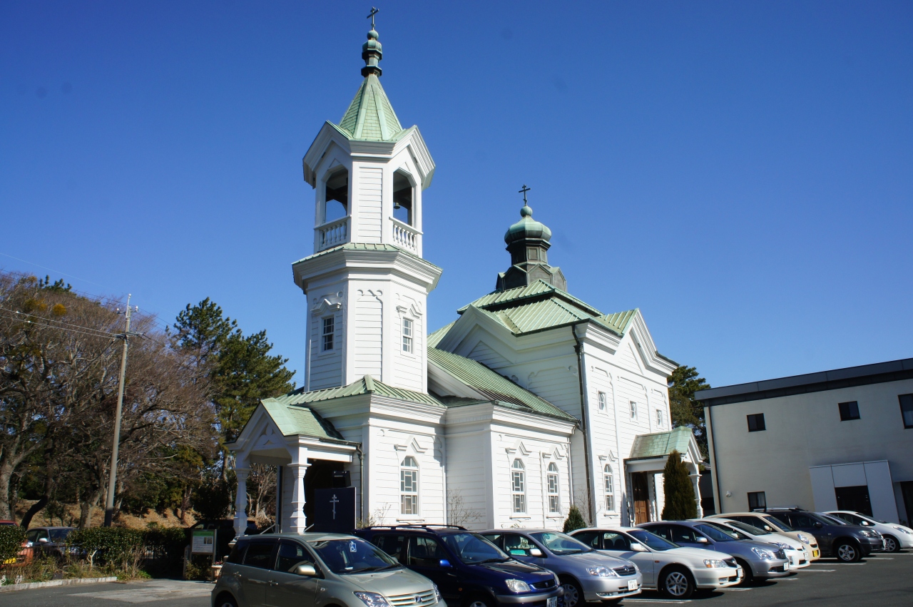 豊橋ハリストス正教会は、ロシア正教会の教会。「ハリストス」とはキリストのロシア語読みです。豊橋への正教会の布教は1875年から。この教会の建設は、1913年。初代管轄司祭の35周年を記念して建てられました。全体として、函館のハリストス正教会にも大変よく似て、整った美しさをもっていますが、規模はかなり小ぶり。正面に駐車場がありまして、車がずらり止まっていると、教会の小ささが余計目立つように感じました。なお、建物は国の重要文化財で、内部は非公開。外部からの見学のみです。