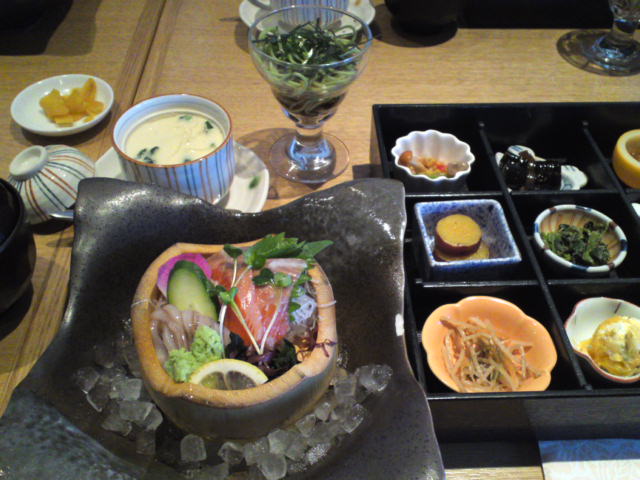 限定のランチでもあったため、お刺身や前菜小鉢9品、茶そば、茶碗蒸し、タジン鍋の蒸し野菜、そして○穀米、食後はチーズケーキにコーヒー(紅茶)と品数も多かったです。