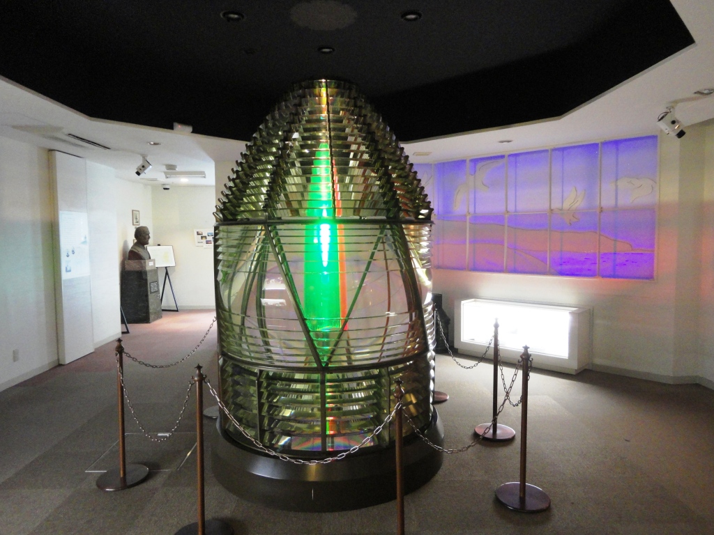 太平洋が一望できる野島埼灯台に上る前に、ちょっと灯台のお勉強。日本で2番目の洋式灯台ですから、知識を入れておかないと。それが可能なのが、灯台のすぐそばにある資料展示室「きらりん館」です。展示室に入ると中央にどーんと野島埼灯台と同じサイズのレンズが置いてありました。間近で見ると、なかなかの迫力です。ただし、野島埼灯台のものではなく、福岡県の玄界灘にある烏帽子島灯台のものだから、あれって感じですけどね。