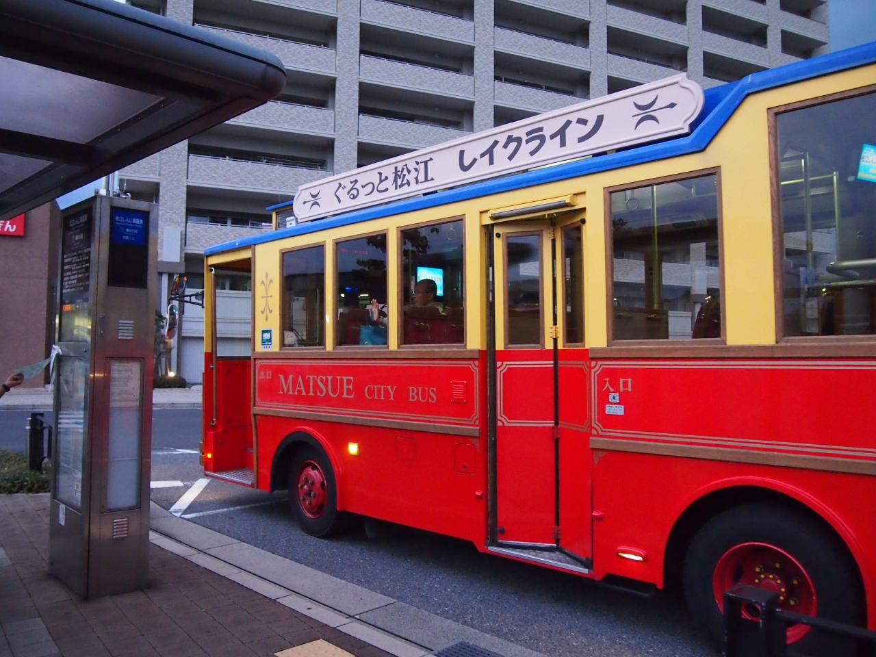 観光に便利なスポットはもちろんですが、夕方以降の時間帯はキレイな夕日で有名な宍道湖の夕日鑑賞スポットのほうまでまわってくれます。 これを楽しみにしていたのですが、私が行った時はお天気が悪かったのと、日の入り後にバスに乗ったので夕日は見れず残念! またいつか観に訪れたいと思います!!