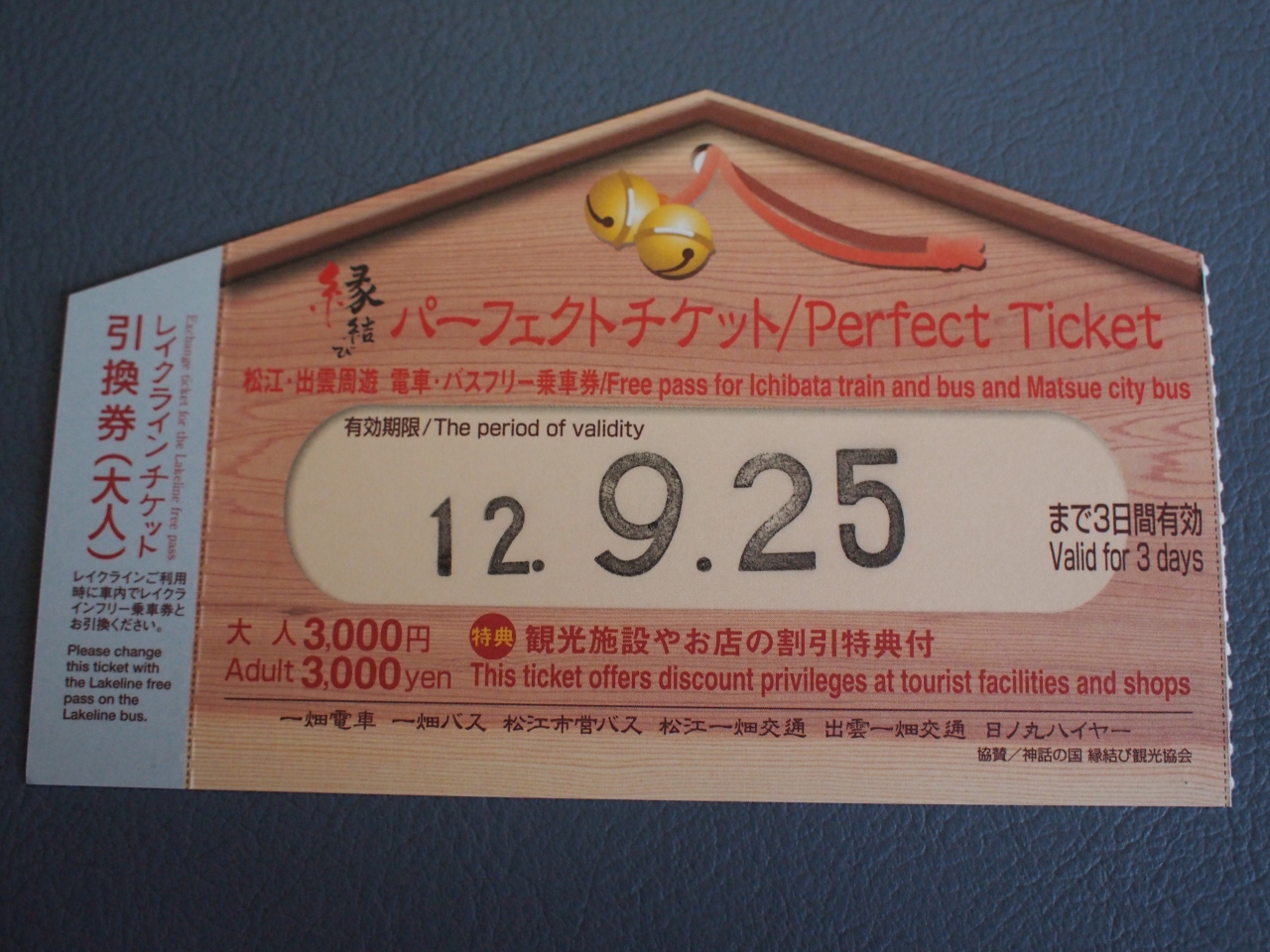 島根の松江を観光で訪れた際に利用しました。 1回の乗車は大人200円で、1日乗車券は500円なので、レイクラインを使って1日フルで観光するならかなりお得ですね。 私は、一畑グループの縁結びパーフェクトチケットを同じ日にちに買っていて、その左側の小さな半券をレイクラインバスの運転手さんに出すと、レイクラインの1日乗車券をもらう事が出来ます。 私が利用した時は運転手さんは女性でしたが、停留所ごとに丁寧なアナウンスをプラスしてくれました。