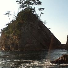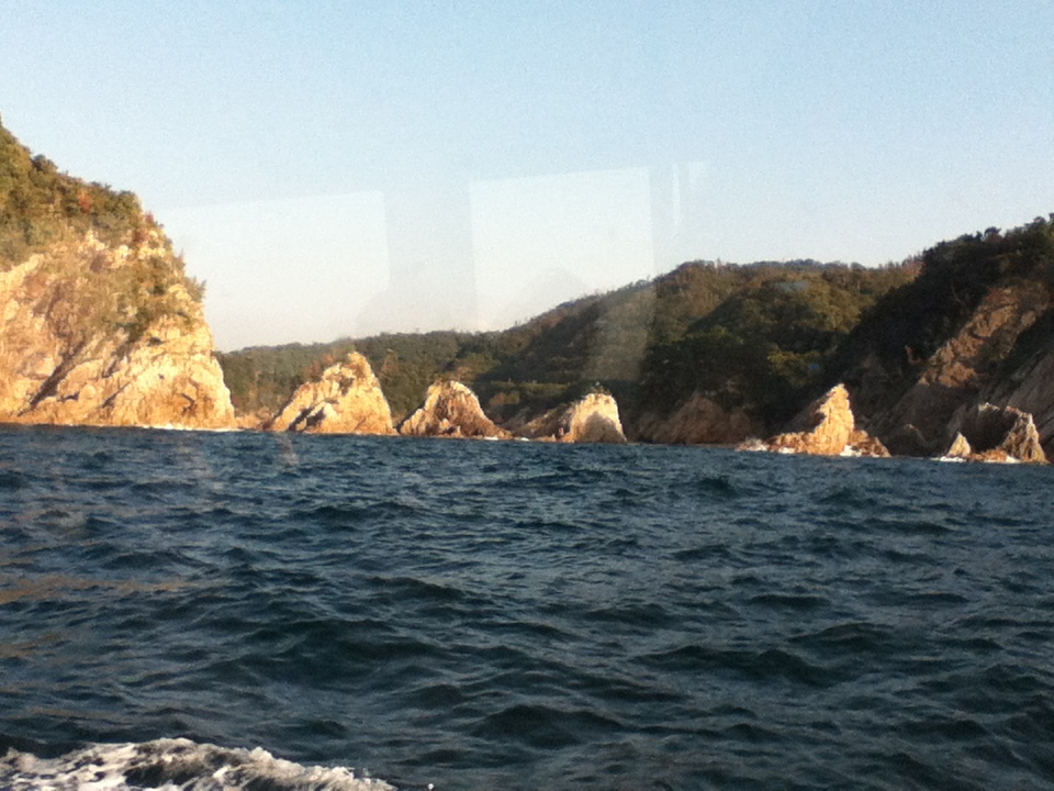 船は前方が屋内座席、後方がデッキ。港を出ると、さすが!日本海だけあって波が半端なく荒い。船長さんが、これくらいの波なら大丈夫ですと言っているからそれを信じて…でも、大きな波が来ては船が大きく傾いて進んで行くのでちょっと怖かった。船長さんは舵を取りながらマイクで景色等の案内もしてくれます。山陰の松島と呼ばれるだけのことはあって小島のような岩のような…景色や洞窟や、素敵な景色でした。進行方向右側に座るべし!
