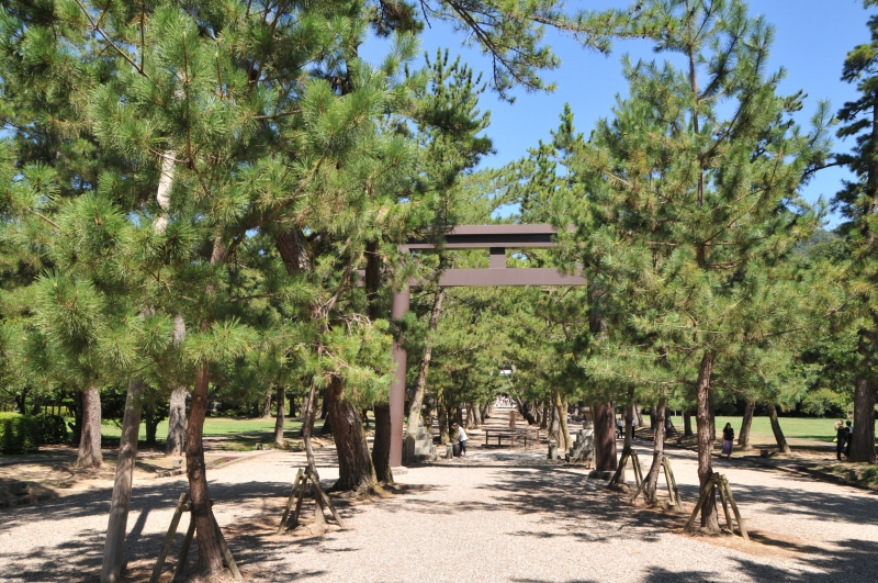 出雲大社の境内の入口にある大きな鳥居から本殿に向かって真っすぐ延びる広い参道です。参道の両側に続く松並木は寛永年間(1624~44)に奉納されたものです。松並木を保護するため、松の木の間を歩くことができない区間があります。