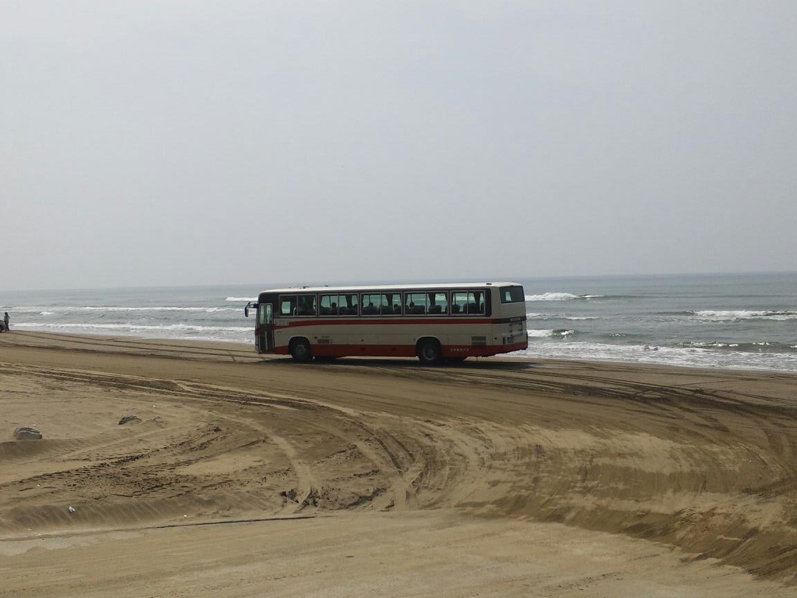 ここ千里浜は漫画「めぞん一刻」にも登場する観光地です。作中でも観光バスが走るシーンがありますが、実際に定期バスが砂浜を走っているのを見ると大変不思議な気分が味わえます。