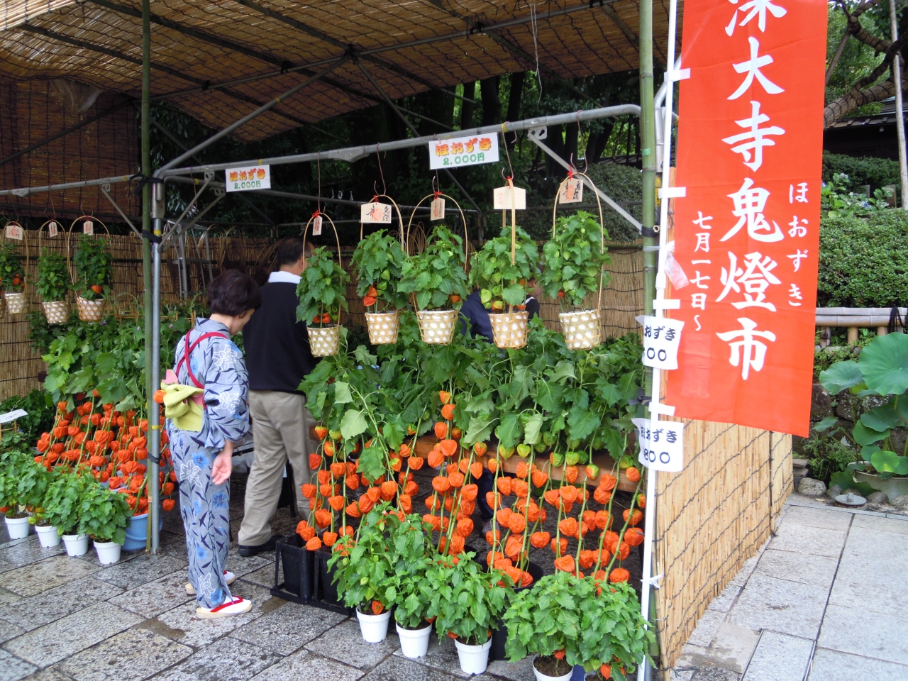 近所にある深大寺の鬼灯(ほおずき)市。深大寺の趣のある雰囲気のある中、えんじ色のあざやかな風貌がまた格別。ほおずきの鉢ではなく、枝ほおずきを購入。家でほおずきに息を吹きかけて音を鳴らすことにチャレンジするもあまりうまくできず。残念!