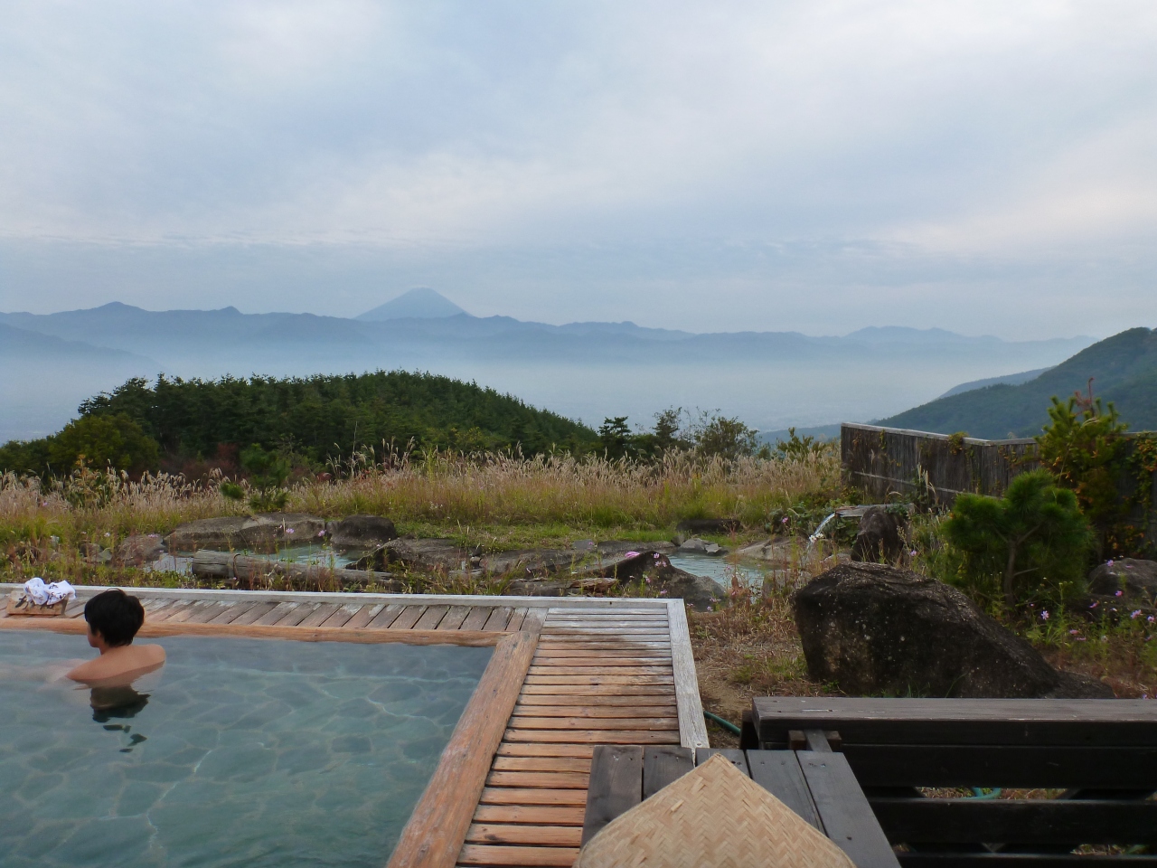 海抜700メートルから富士山と甲府盆地を望むここ「ほったらかしの湯」は、その眺望の広がりという点では私の経験の中ではベスト3にはいる素晴らしさでした。数回訪れたことがありますが、幸運な場合は観光バスがいない状態でゆっくりお湯と景色を楽しむことができます。最近は日の出前から開放していただいているみたいなので夜空~朝日が楽しめるようです。