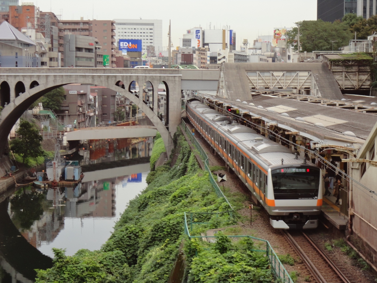 関東大震災後の昭和2年に建てられたアーチ橋です。御茶ノ水橋から見る聖橋はJR御茶ノ水駅、黄色い電車、オレンジの電車、神田川、川淵のお店そして聖橋と、とても良い風景です。JR御茶ノ水、千代田線新御茶ノ水駅から聖橋を渡って坂を降りていくと、神田明神に行きます。