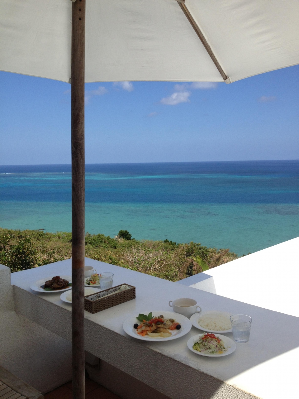 10月の日曜日お昼ちょっと前に入りましたが、運良くテラス席に座ることができました。目の前に広がるエメラルドグリーンの海と真っ白なテラスのコントラストがなんともいえず美しく、雑誌のグラビア通りのステキなカフェでした。