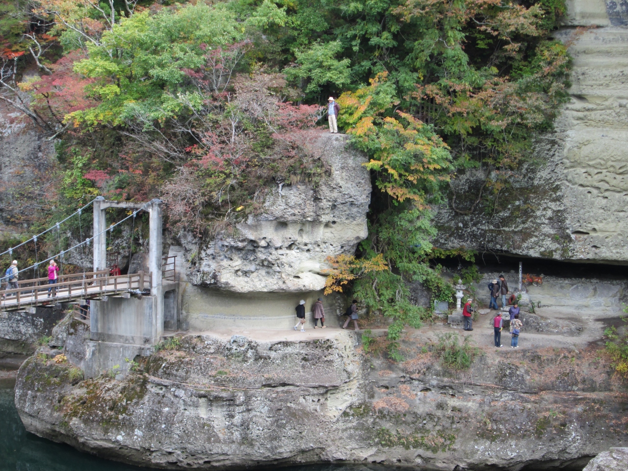 塔のへつり駅から徒歩5分程度で行けます。10/26(金)に訪問しましたが、紅葉のピークは11/3(土)前後かもしれません。橋は定員30人程度だそうで、同時に数人渡ると結構揺れます。橋を渡って奥に行く岩場には写真のように柵がありません。スリルがあって良いのですが、川まで高さがありますので、お年寄りや子供連れの方は注意が必要です。