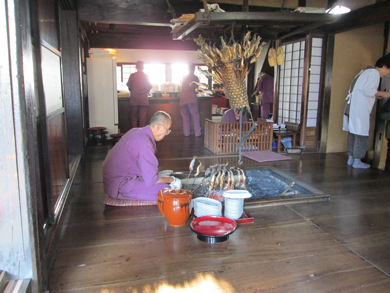 先週の金曜日に訪問しましたが、平日とは思えないぐらい混んでいました。昼時は既に予約されている方がほとんどで、2時間待ちぐらいでした。ガイドさんの話によると、大内宿のなかで一番人気のお店で、15時を過ぎると空いているとのこと。15時頃訪問すると20分待ちと言われ、予約して待ちました。入口には囲炉裏があり魚を焼いています。店員さんに「新そばです」と言われ食べましたが、歯ごたえ、香りともに最高においしかったです。だしは冷たく、辛み大根が入っているのと、ねぎをかじりながら食べると少し辛かったです。写真のように箸も付いてくるのでねぎで食べれない場合は箸でも食べれます。