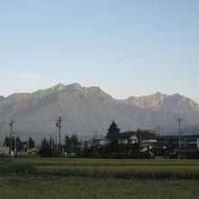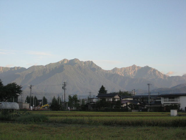 駅から少し歩いてアルプスの山々を撮影した。岩肌がでているのがわかる。上空が飛行機のルートになっているので、何本も飛行機雲が見えます。