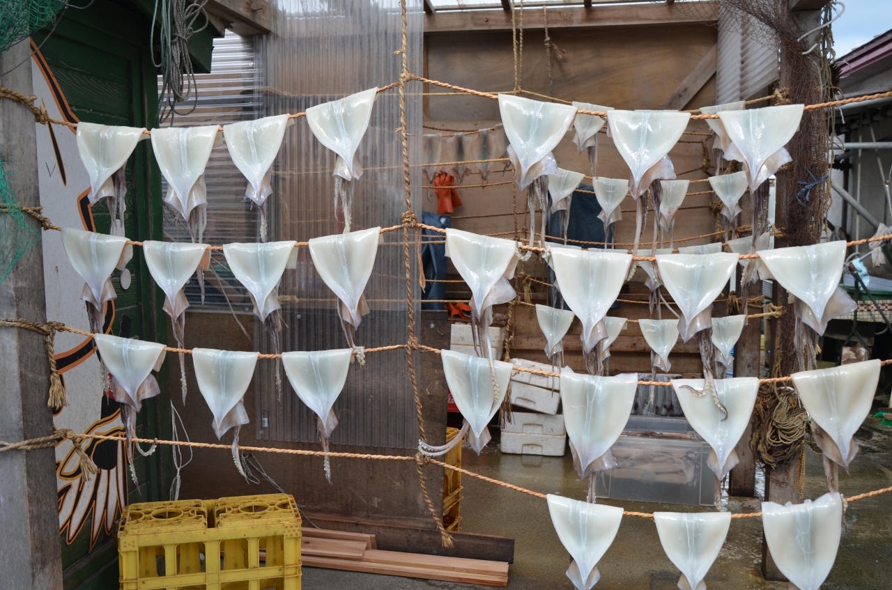 鯵ヶ沢の海岸沿いの通りに、この辺りの名物になっているイカをカーテンのように吊るした光景を見ることができる一角があります。ここが通称焼きイカ通りと呼ばれていますが、その中に菊屋商店というお店がありまうが、このお店には、鰺ヶ沢で一番人気物のワンコがいます。そうです、あのブログでブレイクして映画化された、ぶさかわ犬、わさおのいるお店です。